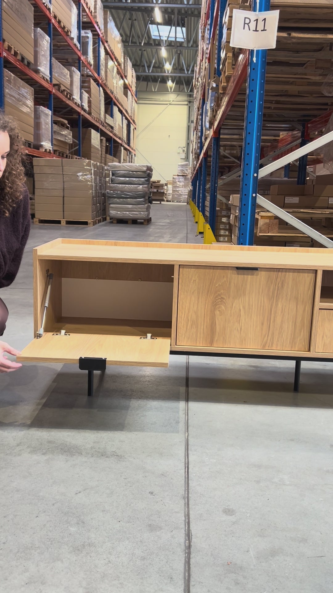 EDISON RTV 200 w wybarwieniu jasny dąb łączy minimalistyczną, horyzontalną sylwetkę z ciepłem naturalnego rysunku słojów. Smukły korpus, uniesiony na czarnej metalowej podstawie, wprowadza do salonu lekkość i porządek wizualny — długi blat pięknie eksponuje dekoracje, a równy rytm frontów uspokaja aranżację.